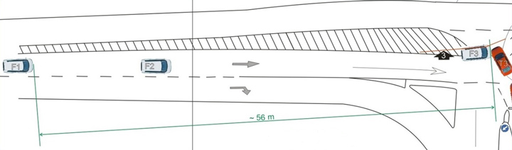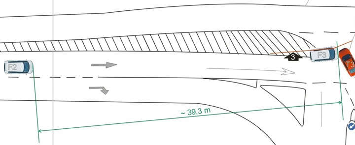 Vozilo Toyota se nalazilo 0,6 s na prometnoj traci kojom se trebalo kretati vozilo Fiat i uslijed pojave vozila Toyota vozač vozila Fiat poduzeo je radnju kočenja i izmicanja u lijevo s ciljem izbjegavanja kontakta.