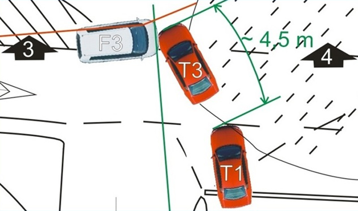 4. Od mjesta reagiranja kočenjem do mjesta sudara (F2-F3) vozač vozila Fiat je prešao put u dužini od oko 39,3 m za 2,4 sekunde. Vozaču vozila Toyota za prijelaz puta od mjesta uključivanja do mjesta sudara (T1-T3) u dužini od oko 4,5m potrebno vrijeme iznosi 3 sekunde. Razlika vremena kretanja iznosi oko 0,6 s, što znači da je vozilo Toyota bilo u fazi uključivanja na prometnicu 0,6 s. Nakon uočavanja vozila Toyota 0,6 s na svojoj putanji kretanja vozač vozila Fiat je reagirao otklonom upravljačem i kočenjem.