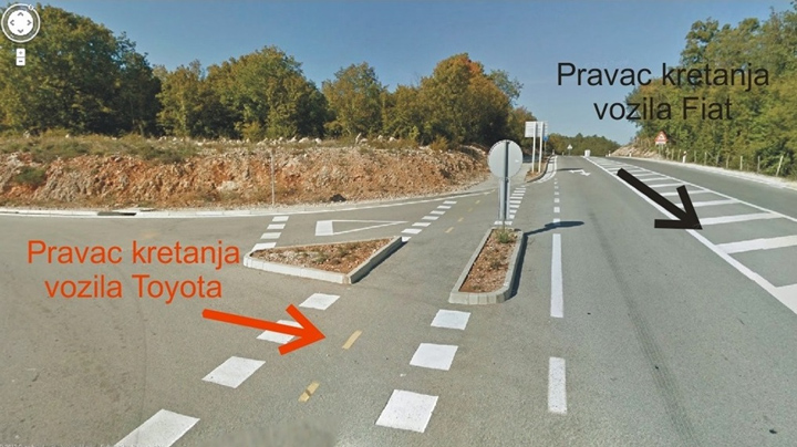 1. Prometna nezgoda se dogodila na otoku NN, na raskrižju cesta. Na raskrižju je bio postavljen prometni znak „STOP – obvezno zaustavljanje“, koji je vrijedio za vozilo Toyota i ograničenje brzine kretanja 60 km/h, koji se odnosio na smjer kretanja vozila Fiat.