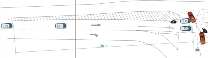 Od položaja vozila Fiat u momentu pred nastavak kretanja vozila Toyota (F1) do mjesta kontakta vozilo Fiat je prešlo put od oko 56 m. Ako se radilo o konstantnoj brzini kretanja vozilu Fiat je za prelazak navedenog puta potrebno vrijeme 3,4s.